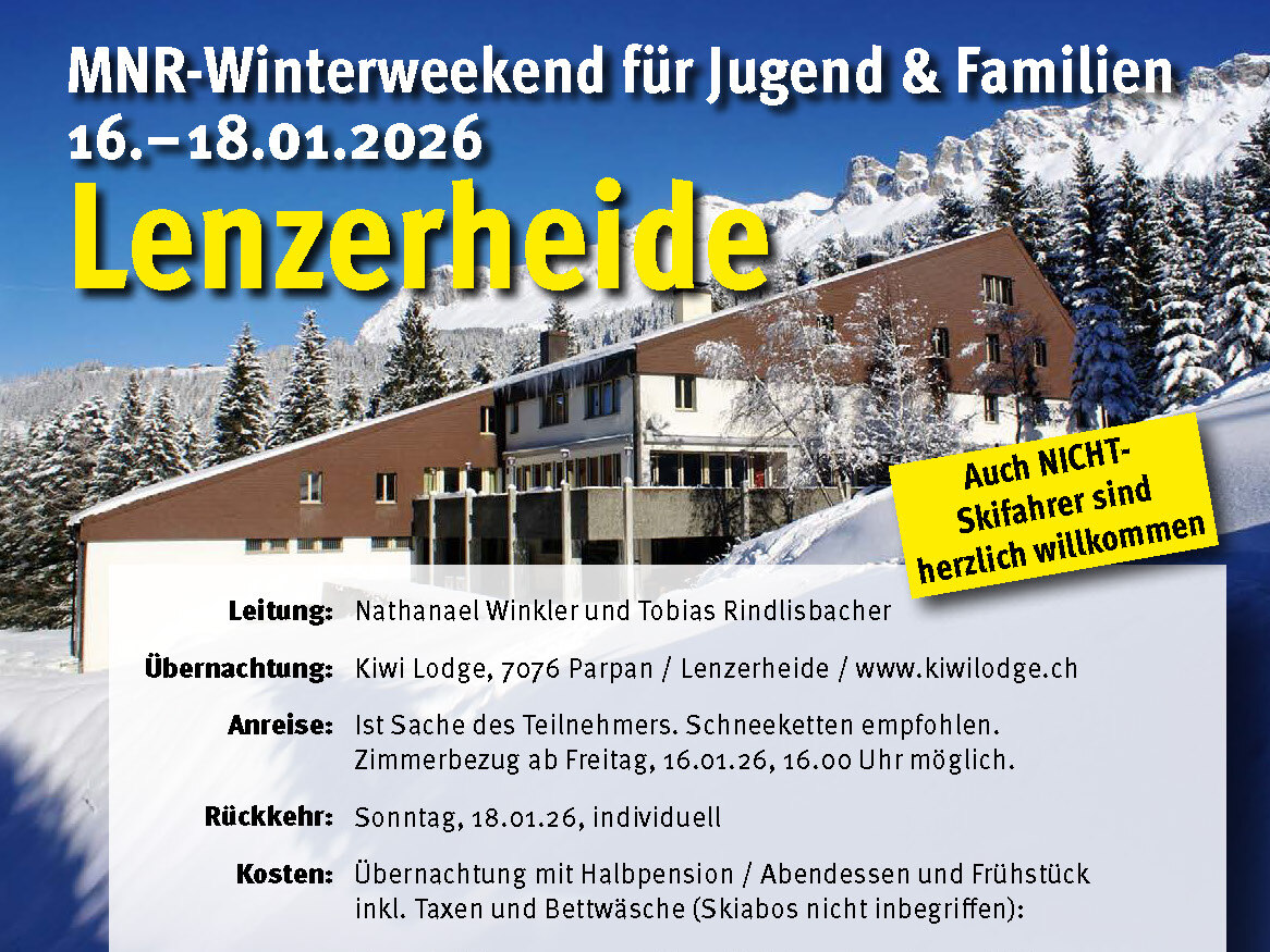 Herzliche Einladung zum MNR Winterweekend in der Lenzerheide (Parpan). Alle Details können Sie dem Flyer entnehmen. Wir freuen uns auf einen schöne Gemeinschaft und laden auch alle Nicht-Wintersportler ein.