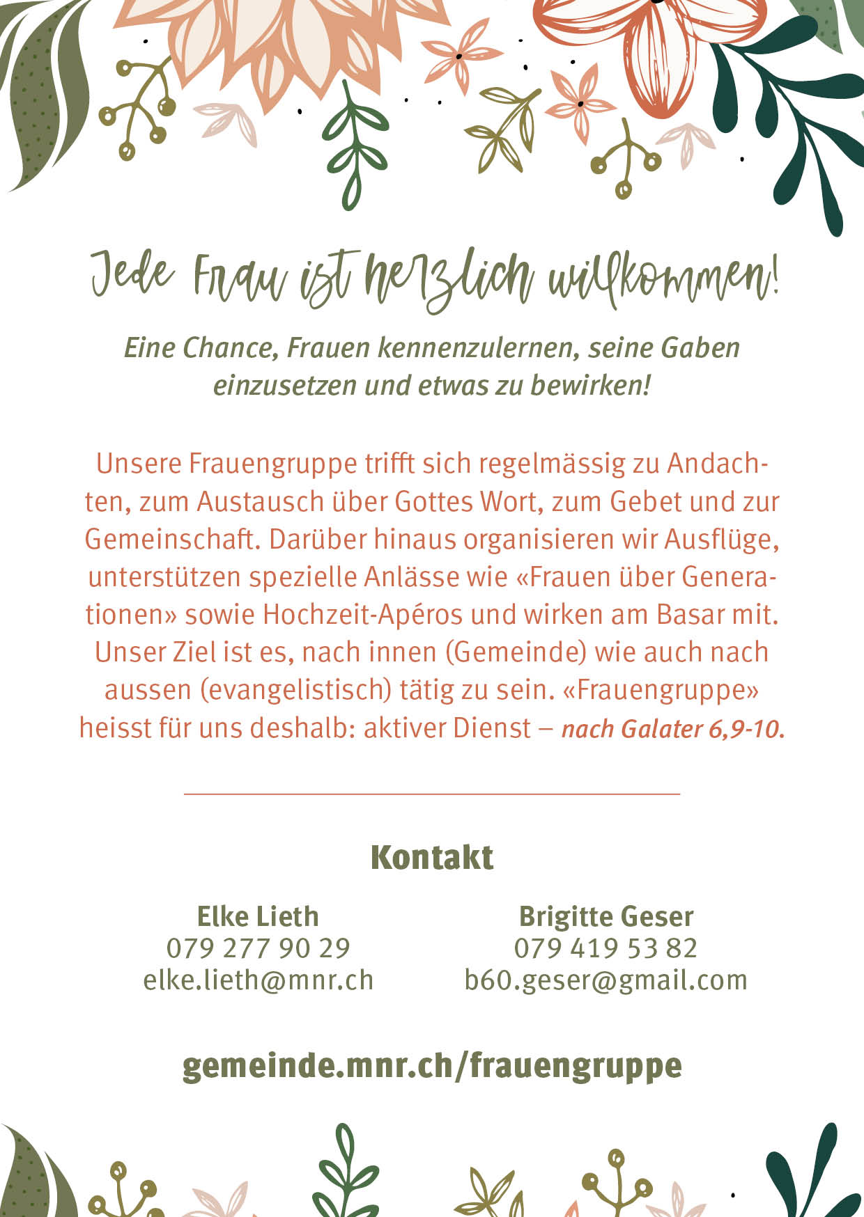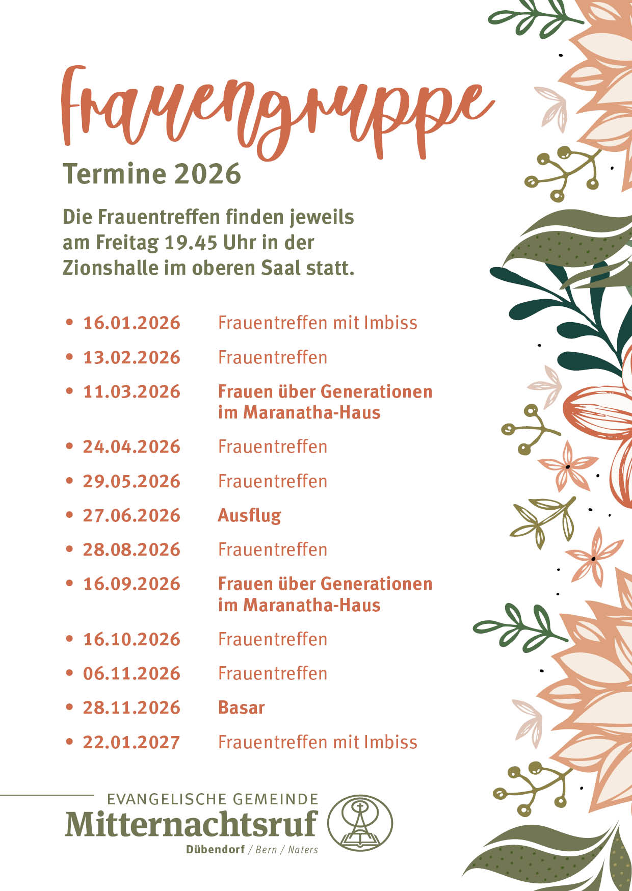 Unsere Frauengruppe trifft sich regelmässig zu Andachten, zum Austausch über Gottes Wort, zum Gebet und zur Gemeinschaft. Darüber hinaus organisieren wir Ausflüge, unterstützen spezielle Anlässe wie «Frauen über Generationen» sowie Hochzeit-Apéros und wirken am Basar mit.
